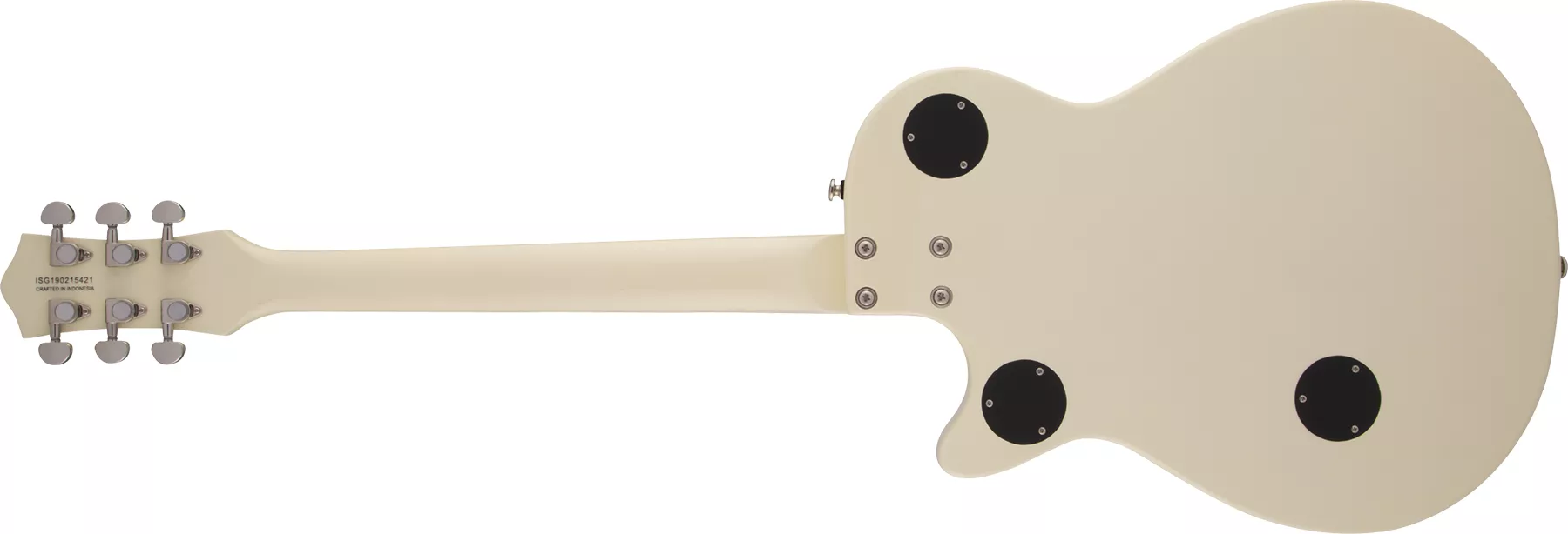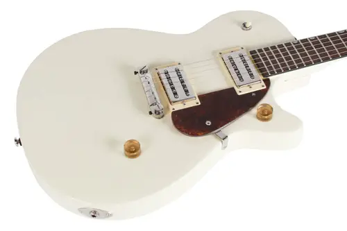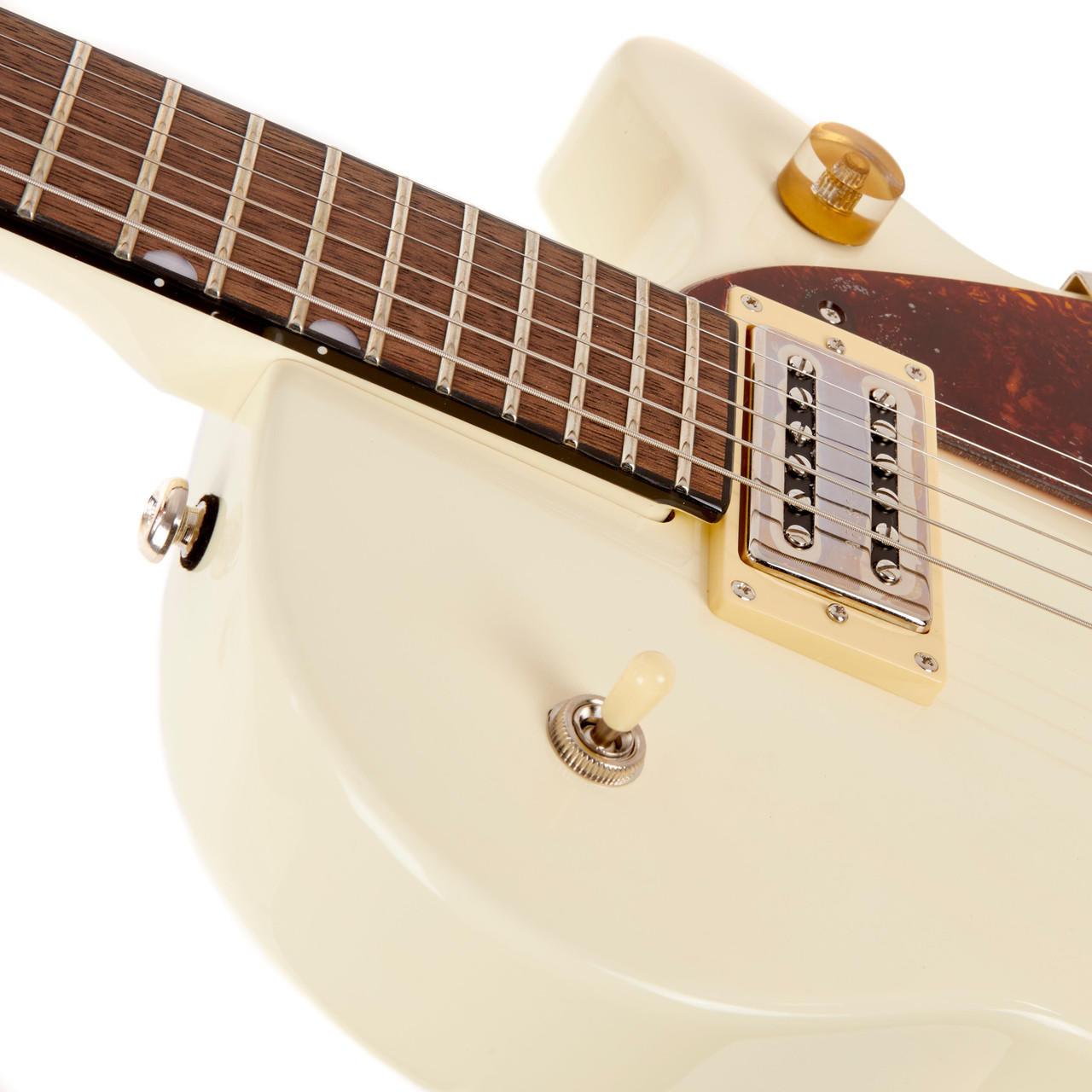 Variante ré-imaginée et démocratique de l’iconique Gretsch Jet, la GRETSCH G2210 Streamliner Junior Jet Club est une guitare électrique solid body équipée d’un corps et d’un d’un manche vissé en Nato avec touche Laurier 22 frettes, d’une configuration de micros HH Gretsch Broad’Tron, et d’un chevalet/cordier Wrap-Around type vintage.