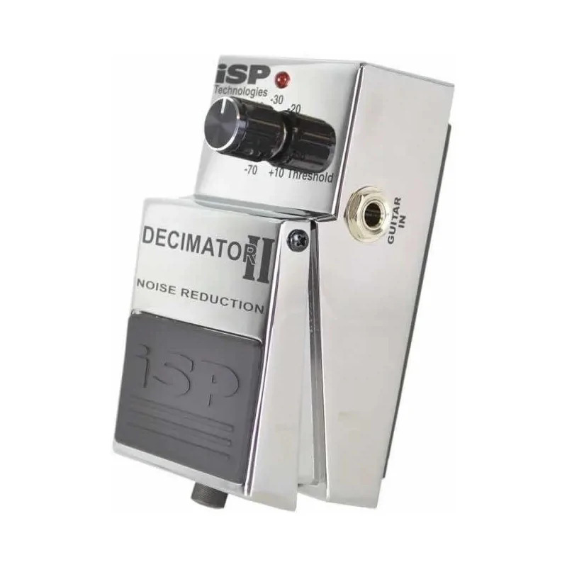 Pédale de réduction de bruit dans un chassis poli et chromé. ISP Technologies, l’inventeur de la réduction de bruit HUSH® présente avec DECIMATOR la dernière génération de réduction de bruit en temps réel.