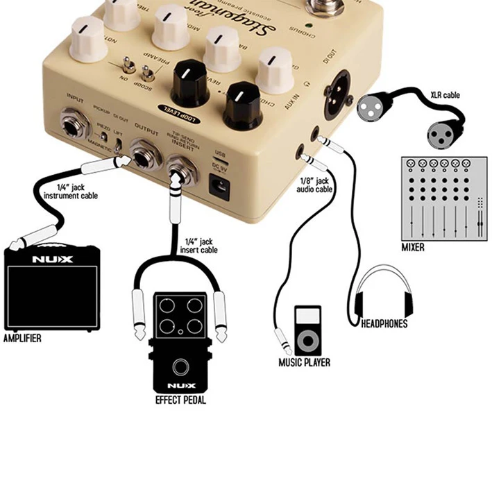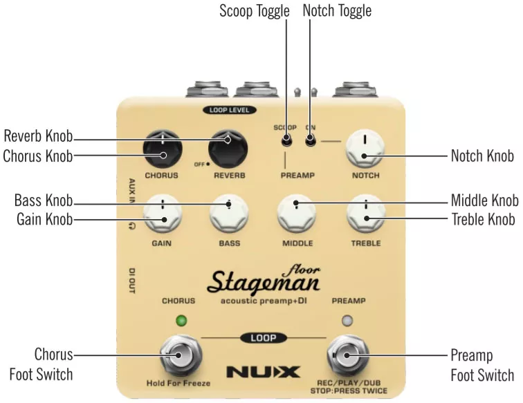La pédale d’effet compacte NUX Verdugo Series Stageman Floor NAP-5 Acoustic Preamp & DI est un pré-ampli analogique pour guitare électro-acoustique doté d’un processeur d’effets numérique (reverb, chorus) et d’une fonction looper 60 secondes.